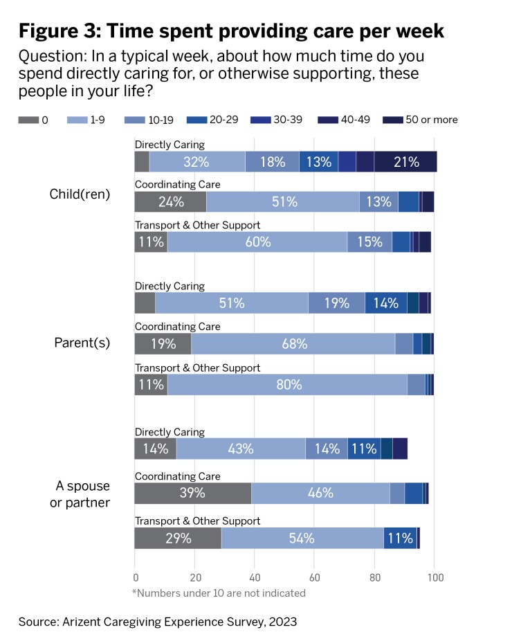 Employees caring for partners and spouses reported spending slightly less time on direct care, but also say they devote a fair amount of time per week to coordinating care, transportation and additional support duties.
