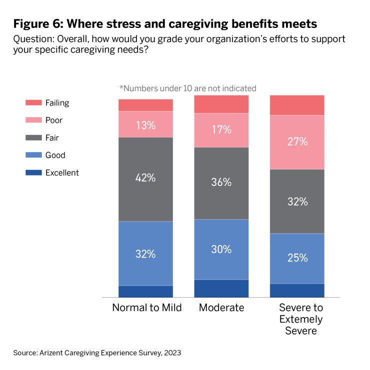 There is a direct correlation between applicable benefits and stress and anxiety reduction among employees. Of employees who reported a severe to extremely severe amount of stress, 37% gave their employer a grade of "poor" or "failing" when it comes to caregiver support. In contrast, of employees who reported a normal to mild amount of stress, just 19% gave their employer a "poor" or "failing" grade (Figure 6).