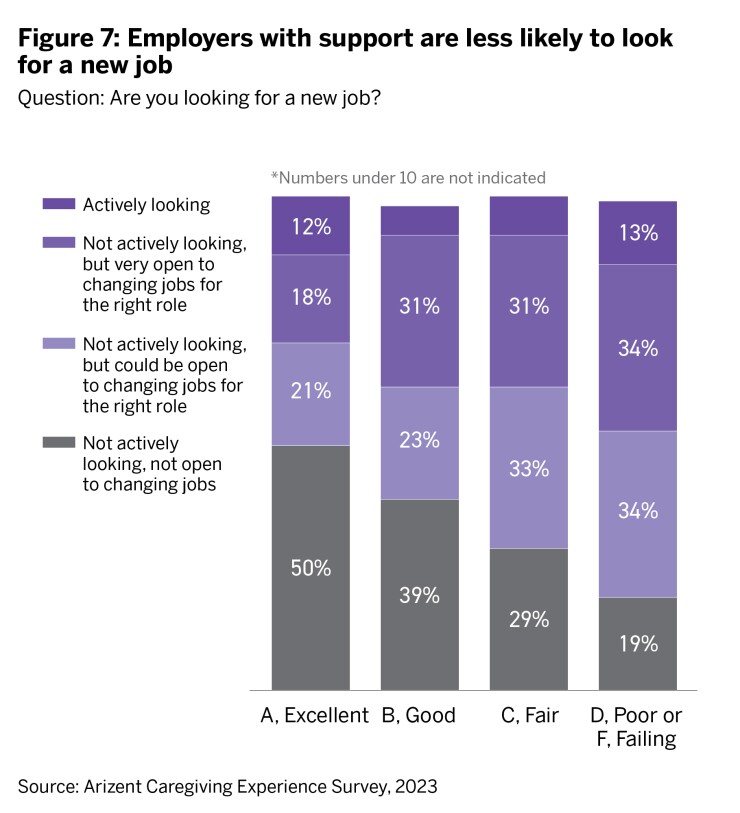 Working caregivers who say their employer supports them are substantially less likely to move on from their job. Seven out of 10 caregivers say they'd be open to a new role, but among employees who gave their company an "A" on caregiver available support, 50% report not being open to a new role at this time (Figure 7). The needs of working caregivers must be a priority if employers are to avoid increased turnover and disengagement within their workforce. High stress and anxiety levels drive burnout and attrition, and workers are looking for resources that offer relief, empathy and overall well-being support.
