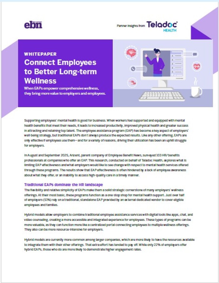 It's not new news that employees who feel supported and equipped with proper mental health benefits have increased productivity, improved physical health and a greater propensity to stay at their job. The employee assistance program (EAP) is a key aspect of employers' well-being strategy, but its value hinges on making support easy to access and relevant to employees' needs.